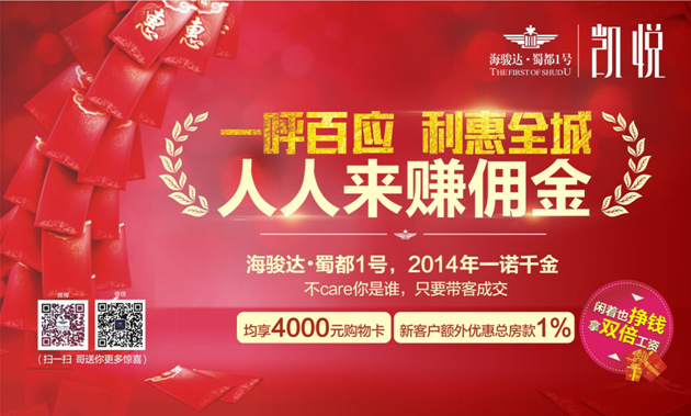 在今晨的“快閃”現(xiàn)場,一張紅色卡片在市民手中流傳,海駿達(dá)??蜀都1號“全民營銷”活動盛大開啟,為響應(yīng)“一呼百應(yīng),利惠全城,人人來賺傭金”的口號,老業(yè)主或推薦人可享受4000元同等價(jià)值的恒創(chuàng)百貨購物卡,新客戶可以享受1%總房款購房優(yōu)惠。海駿達(dá)?蜀都1號,2014年一諾千金!